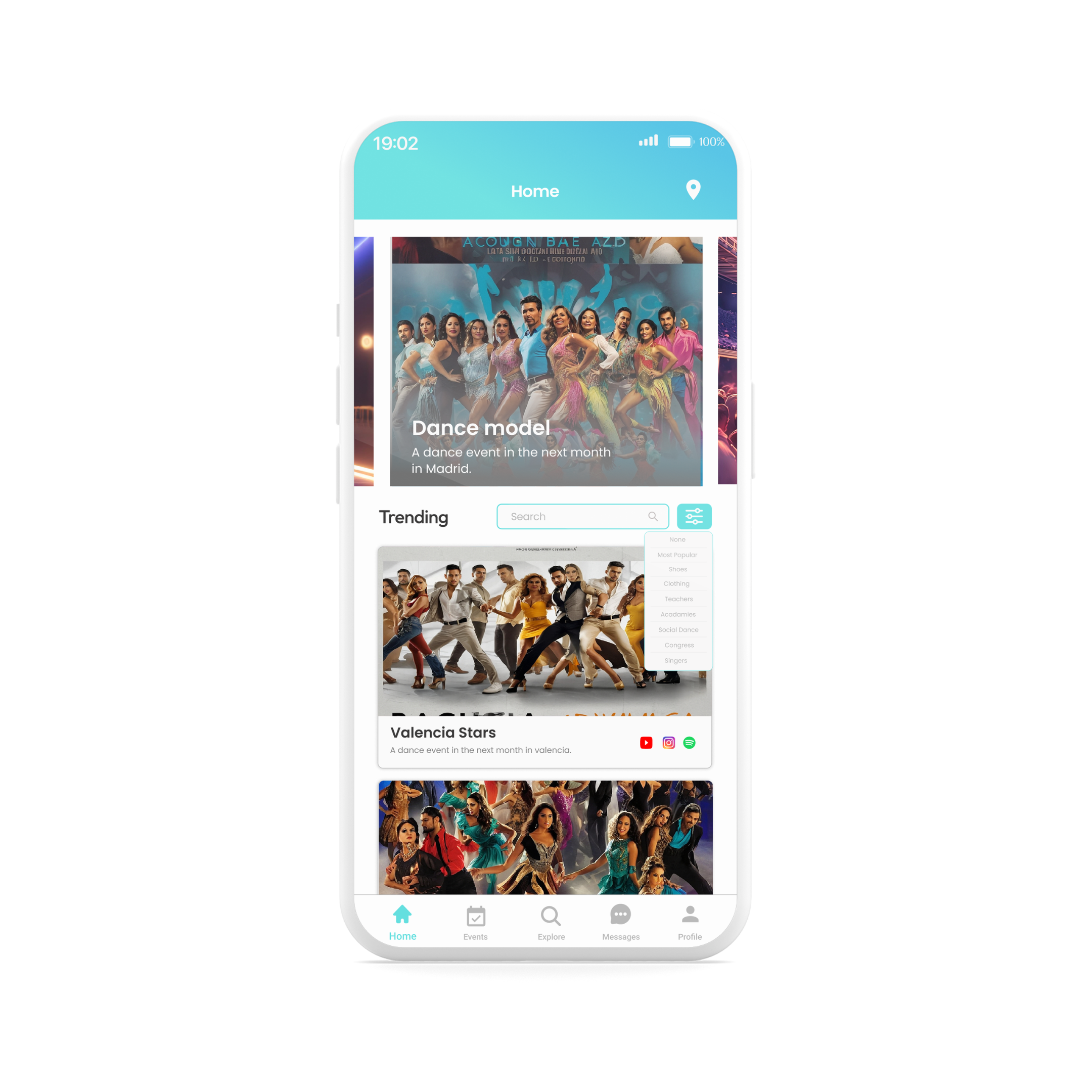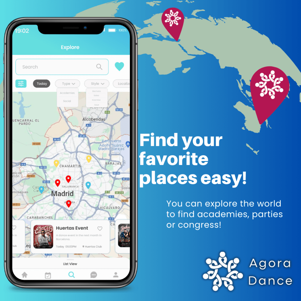 Busca en nuestra pantalla de exploración todas las academias, bailes sociales y congresos, puedes buscar por mapa o lista y puedes marcar tus lugares favoritos para encontrarlos fácilmente!